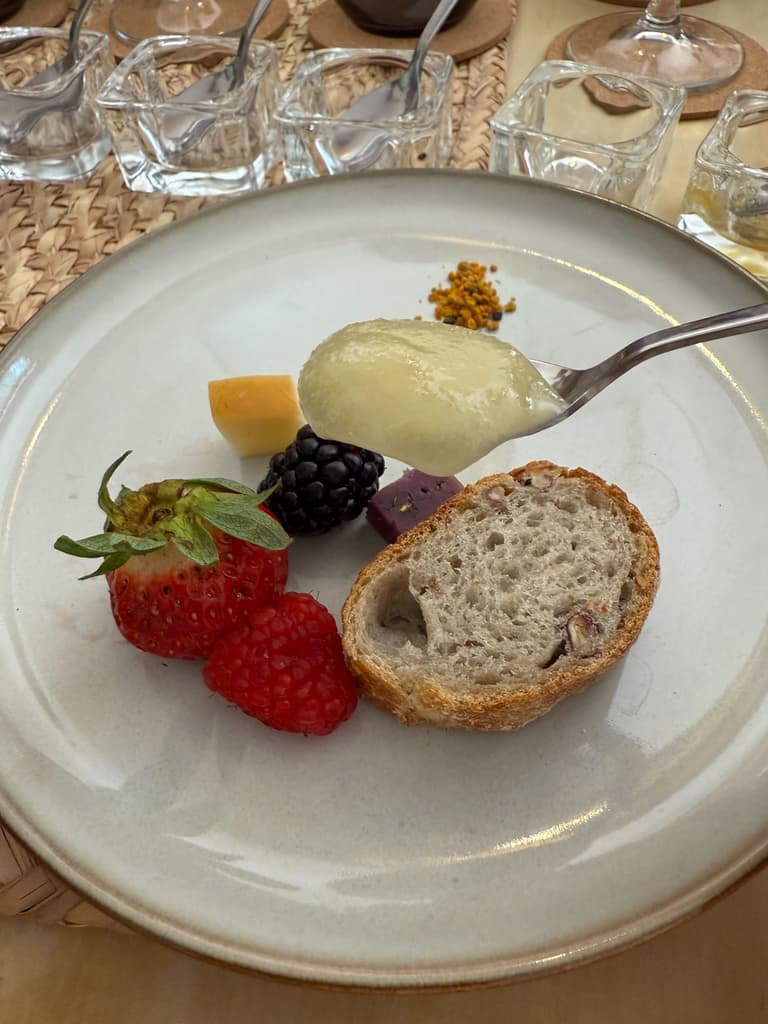 Entre bromas, anécdotas y datos, empezamos a probar las mieles que ella ha traído de distintos productores de México. La primera es una miel de aguacate de Michoacán, esta es espesa, acaramelada y oscura, va muy bien con los quesos que están frente a nosotros.